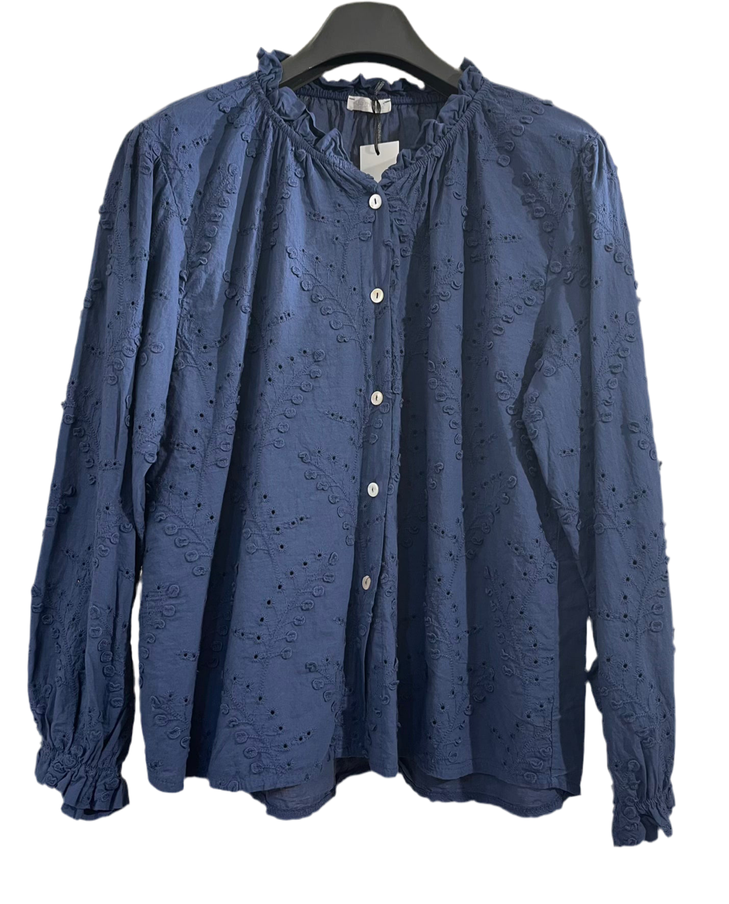 Questa camicia "San gallo Mood" è realizzata in puro cotone e presenta un delicato motivo in sangallo. Con bottoncini sulla parte anteriore e ruches sul collo e sui polsini, è un capo versatile e di tendenza, perfetto per completare i tuoi look estivi. Scopri la comodità e l'eleganza di questa camicia unica.