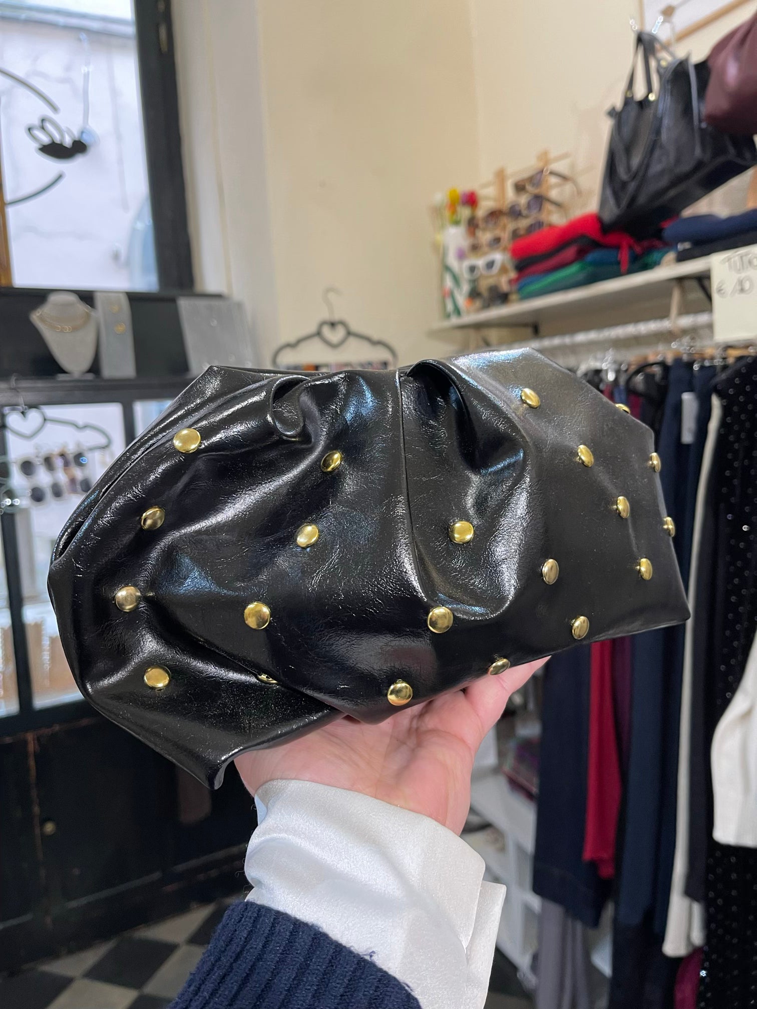 La clutch “Icona” è una borsa in ecopelle caratterizzata da borchie dorate, progettata per un uso pratico senza tracolla. La chiusura con bottone automatico garantisce sicurezza e accessibilità. Ideale per occasioni formali, offre un abbinamento versatile a vari outfit, migliorando l'estetica complessiva.