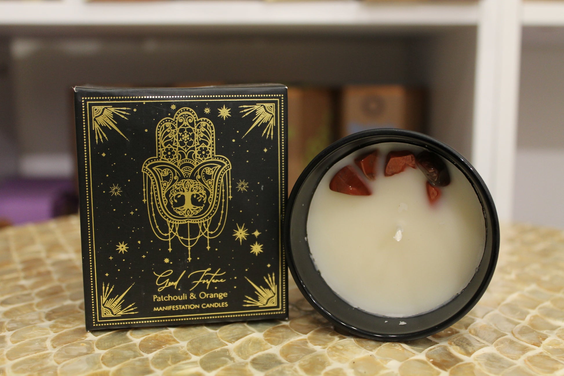 Candela d’intenti in vetro, da 200gr, versata a mano con cera di soia e di palma priva di tossine. Con oli essenziali e pietre. Mentre la candela brucia, le pietre affondano con la cera. Quando la candela è finita, è possibile conservare le pietre.